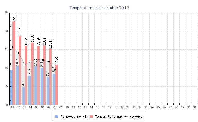 | 08 | 8.5 °C | 10.9 °C | 9.5 °C | 2.0 km/h (10.8 km/h) | ENE |