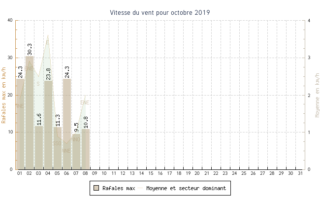 | min | max | moy | Vitesse (rafales) | Secteur | ||